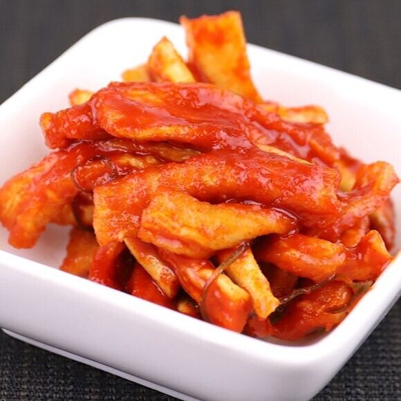 干し大根のキムチです。コリコリとした食感がクセになる一品で、ご飯との相性抜群!!海苔を巻いて、おつまみにもおすすめです。