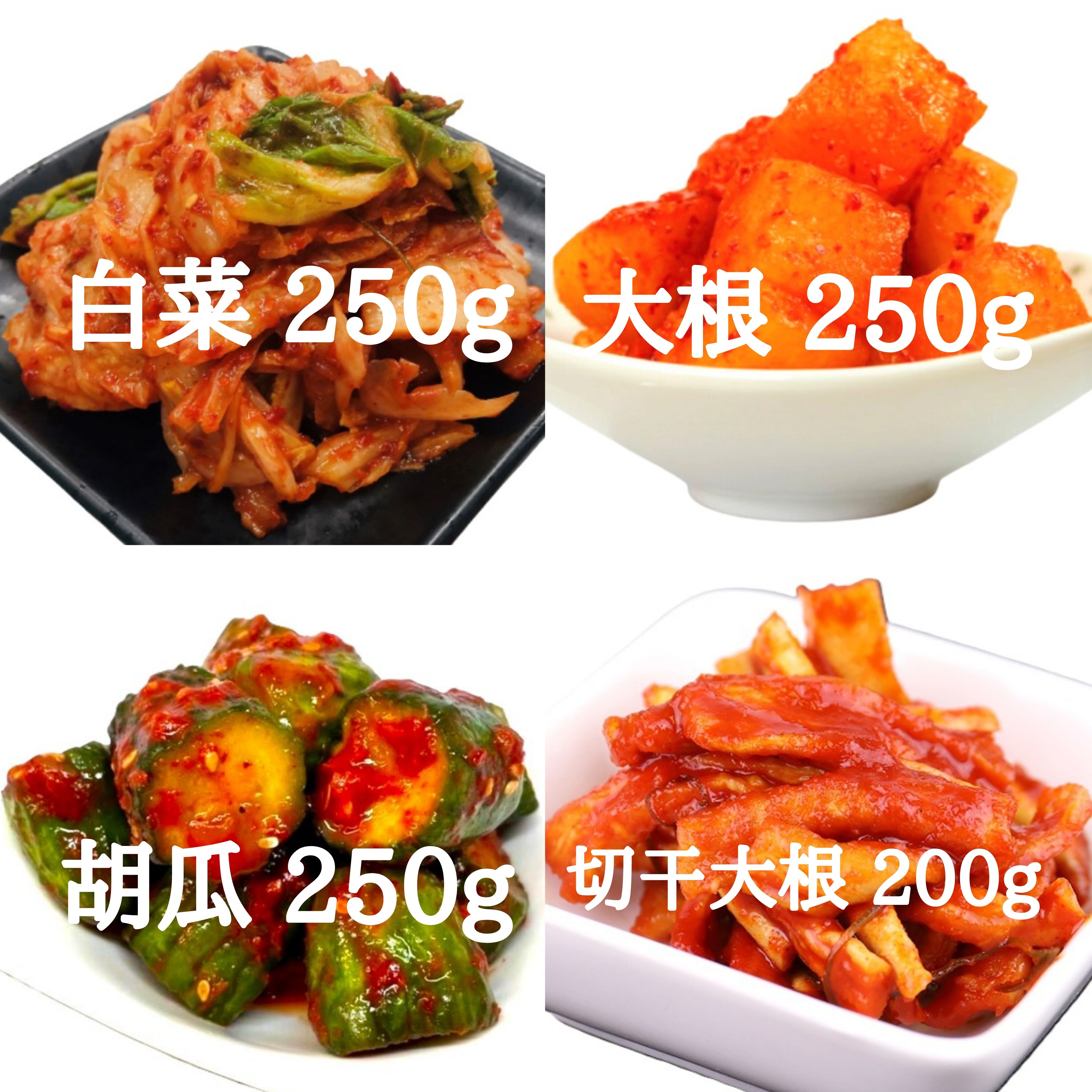 キムチの人気定番 白菜 大根 胡瓜 各250g と切干大根200g のセットです。お酒のお供におすすめです。